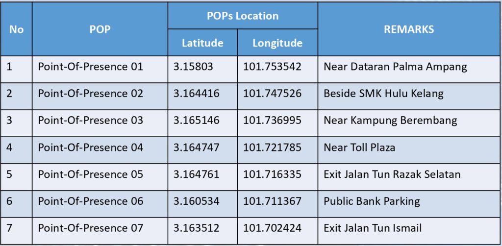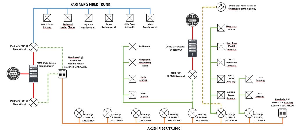 • Along the newly installed 8.5 kilometers of 144 core Fiber Optic Cables, there are 7 drop points to access to the network from Ampang to KL City Center.